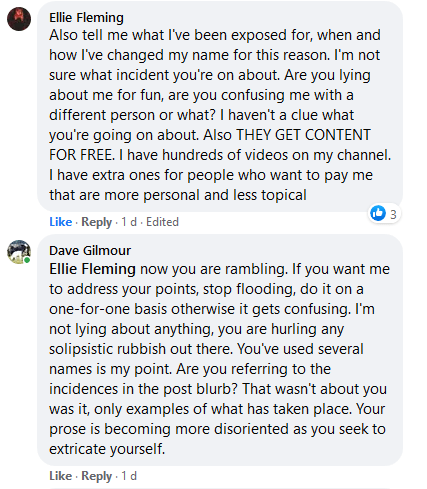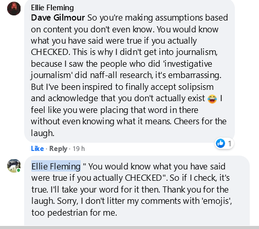 In her incandescent rage at ‘Dave’ she claims her ‘parody’ is ‘parody’ and should be viewed as ‘parody’. No-one has ever said anything about her ‘parody’ other than her and her gang. Anyway, she promised a live-stream in order to ‘get-to-the-bottom’ of things and so with the gallery watching, waiting for the big moment when the ‘artiste’ would arrive with a fully prepared script to deliver the mother of all rational explanations the result was a damp-squib. Her FB comments were incoherent, inarticulate and incomprehensible. and frankly, gibberish.