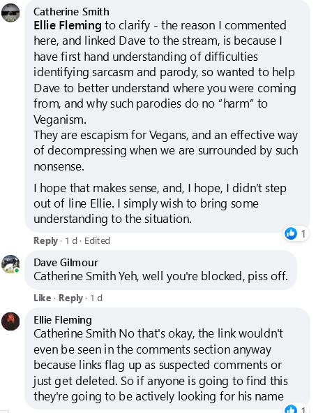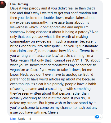 As the was-it wasn’t-it saga continues, the lady in question rallies her sycophantic minions for moral support and decides to do a ‘live stream’. This includes a petty tete a tete on FB in which her inarticulate ranting along with wild accusations and convoluted drivel takes precedence over facts. The question is: is the film ‘parody’? If it is, it’s in bad-taste. Why would anyone demean the vegan movement with third-rate arty-farty nonsense. There has been vegan influencers caught-out and exposed. There has been ex-vegans denigrating the movement. It’s best to leave them to their own devices. To parody them for some obscure ’15 minutes of fame’ is irresponsible. It brings attention to the vegan movement and is used by anti-vegan detractors to subject the movement to ridicule. I’m told that is speculative thinking by someone that can’t show a reference point for their assertion.